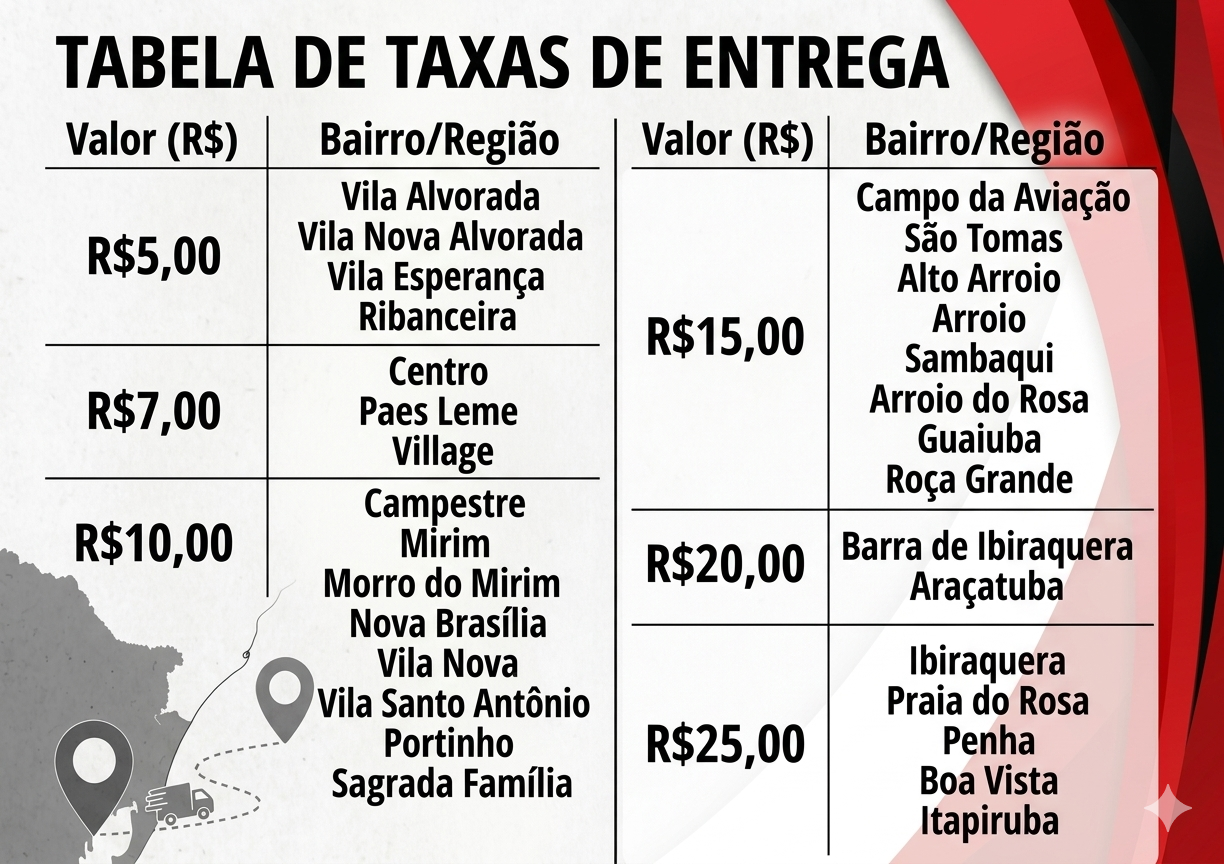 Disponibilizamos a opção de entrega no mesmo dia, válida exclusivamente para a cidade de Imbituba, mediante taxa adicional de entrega.